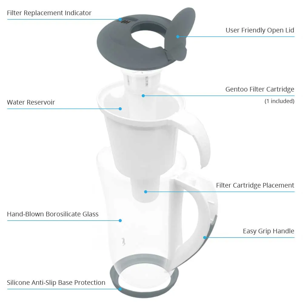 Forget boiling, elaborate filtration systems or the need for electricity. Enjoy purified drinking water with great health benefits quickly anywhere, any time. The Gentoo Glass alkaline water filter jug eliminates chlorine*, fluoride*, contaminants (including heavy metals) and bacteria to minimal level from your water, leaving you with a cup of liquid health.