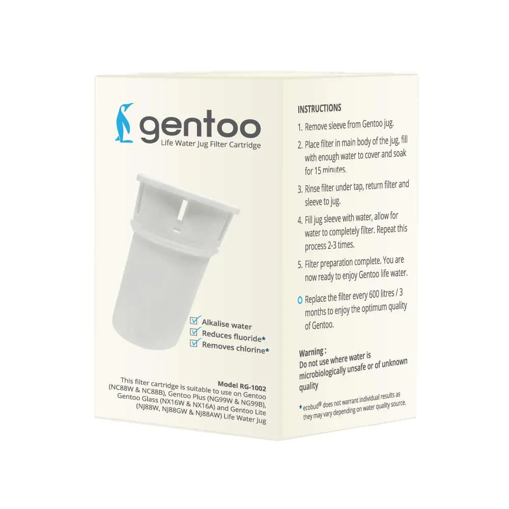 Ecobud Gentoo Replacement Filter - A filter that removes chlorine along with most of the Fluoride and pesticides and bacteria is in my book the best you can hope for and when it's a filter capable of doing all this in a jug rather than an expensive plumbed water filter it's a great thing. I love what my Gentoo jug is capable of for a very economic cost. 12 March 2018