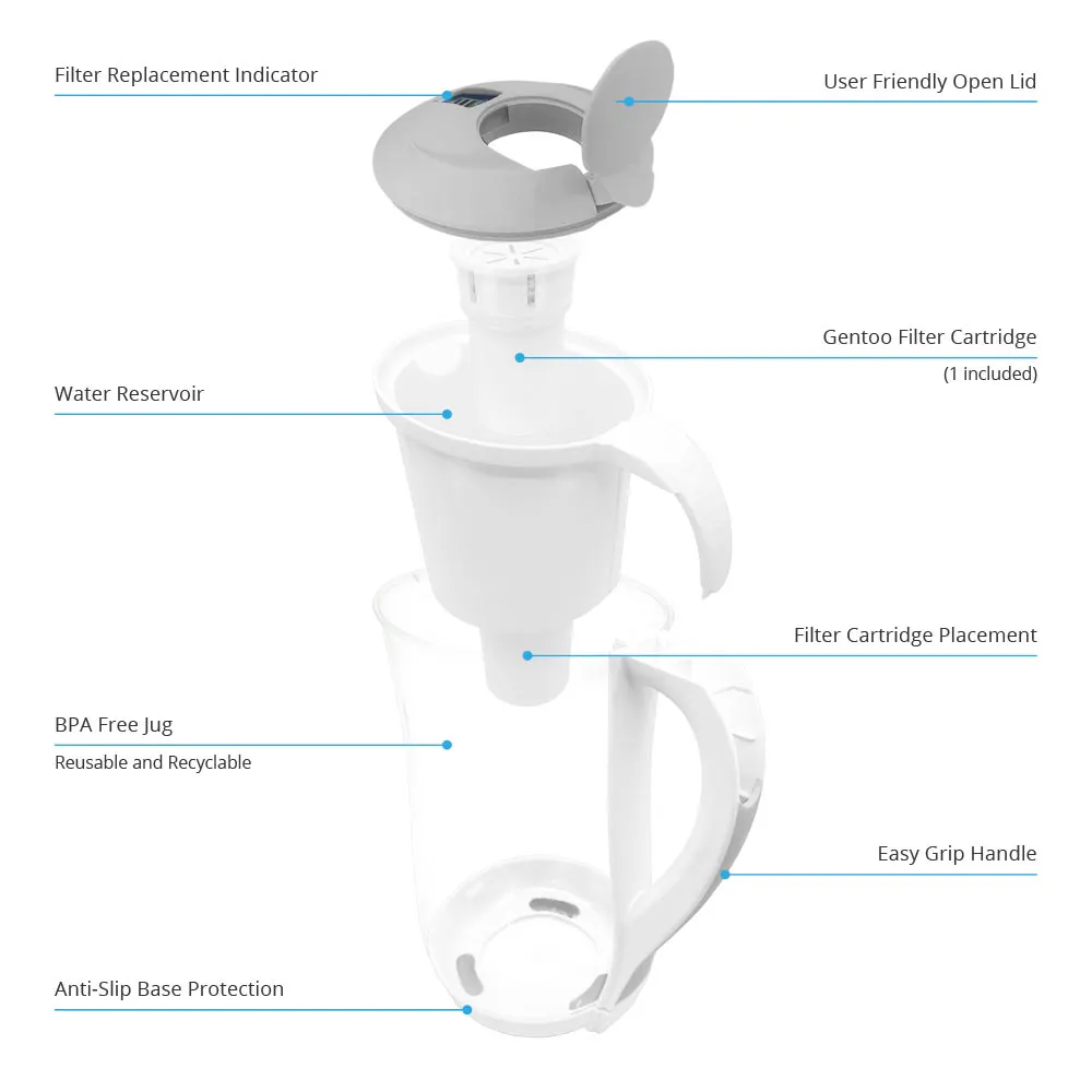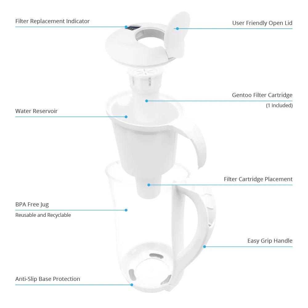 The Gentoo Lite Jug filters water quickly ensuring that anyone can get great-tasting and healthy filtered alkaline water on a busy schedule.